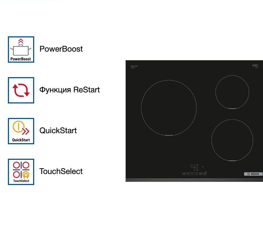 Для удобства повседневного использования предусмотрены функции QuickStart и ReStart: первая запускает нагрев сразу после установки посуды, вторая — восстанавливает настройки после случайного прерывания. Безопасность обеспечена на всех уровнях: блокировка от детей предотвращает несанкционированный запуск, а индикаторы остаточного тепла на каждой зоне напоминают, что поверхность ещё горячая.