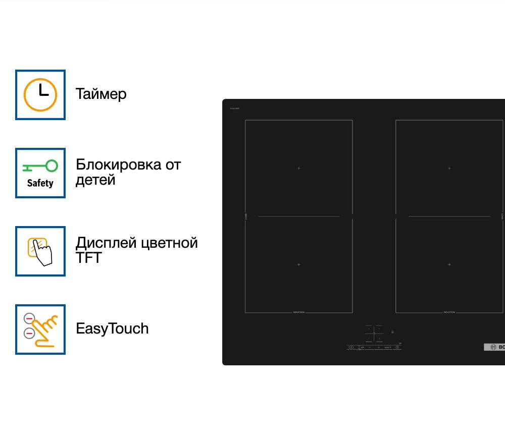 Индукционная варочная панель Bosch PVQ61RBB5E – это современное и функциональное решение для кухни. Произведенная в Евросоюзе, эта модель представляет собой сочетание высокого качества, надежности и стильного дизайна. Стеклокерамическая поверхность черного цвета с прямым краем не только выглядит элегантно, но и обеспечивает легкий уход и долгий срок службы. Панель оборудована четырьмя конфорками, каждая из которых имеет 17 ступеней мощности. Это позволяет точно настроить температуру приготовления, адаптируясь под различные блюда и рецепты. Кроме того, две зоны расширения FlexInduction обеспечивают большую гибкость в выборе посуды для приготовления.