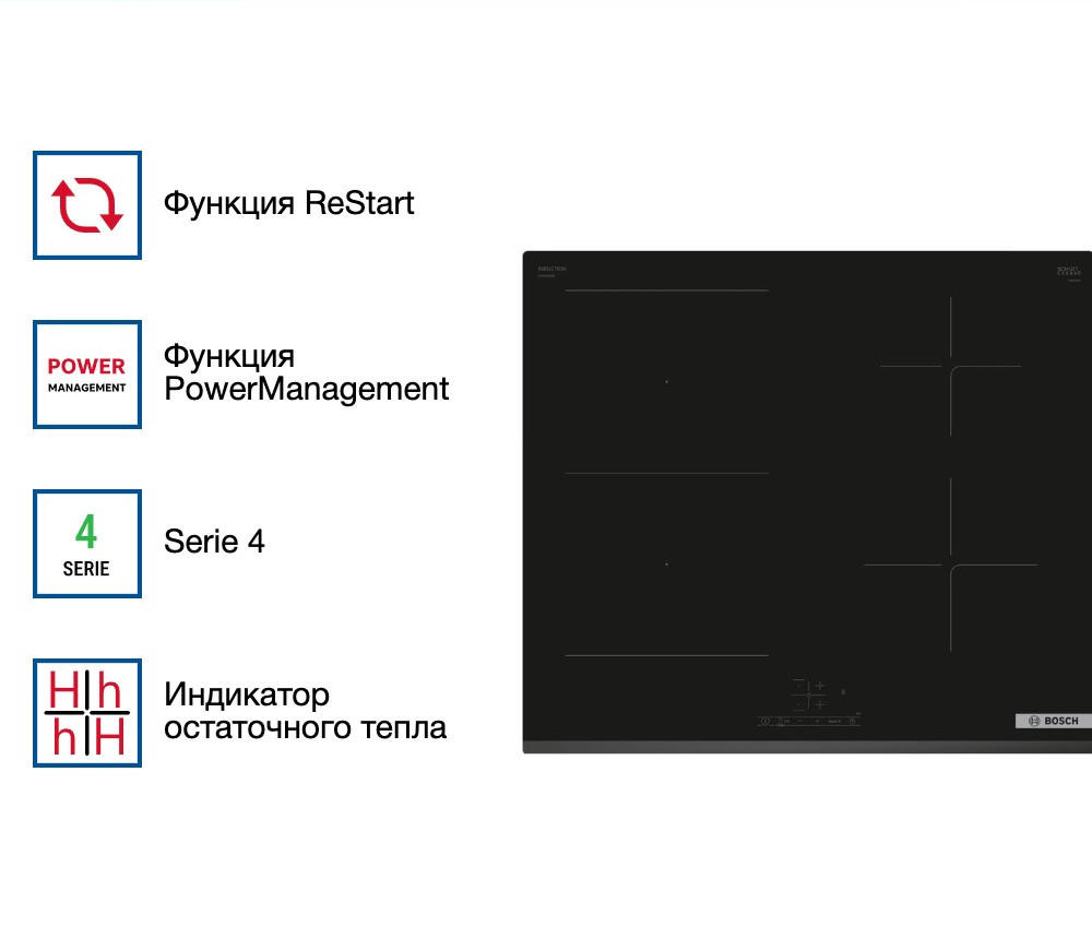 Кроме того, варочная панель оснащена функцией ReStart, которая позволяет быстро возобновить работу после случайного отключения, а также функцией QuickStart для мгновенного включения и функцией PowerBoost для увеличения мощности. Все эти функции обеспечивают высокую производительность и удобство использования.