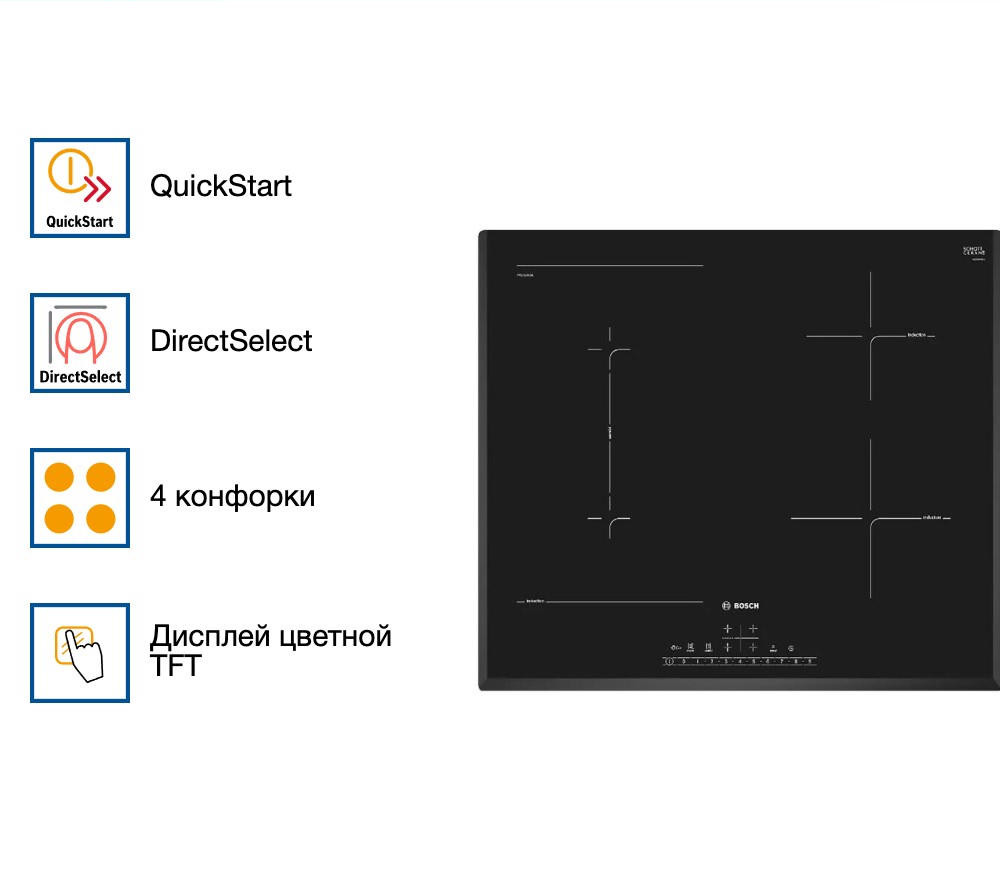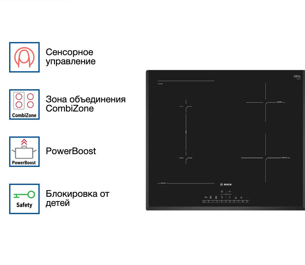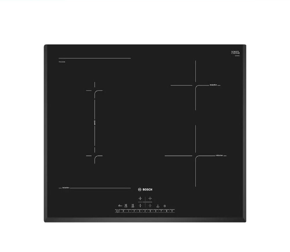 Варочная панель Bosch PVS651FC5E — индукционная модель стандартной формы и ширины. Квадратная, размером 60 на 60 сантиметров, она подойдет и для небольших, и для просторных кухонь. Стеклокерамическая поверхность ровная, ее легко очищать. Достаточно дождаться остывания покрытия и протереть губкой или мягкой тканью с моющим средством, а затем ополоснуть.