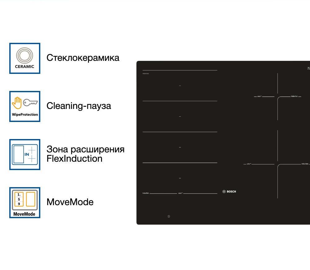 - Гибкая зона нагрева FlexInduction автоматически подстраивается под посуду любого размера.