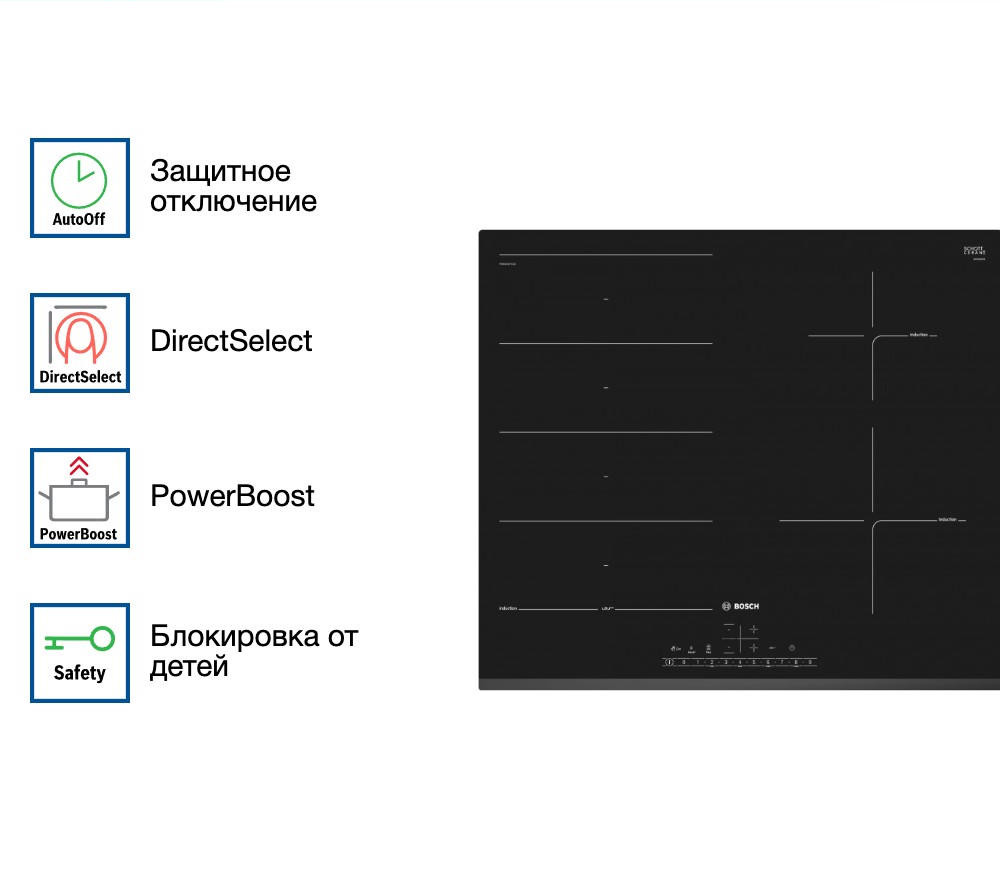 Обратите внимание, как необычно выглядят 4 конфорки. Если вы ставите посуду необычного, большого размера, не стоит беспокоиться о том, что она прогреется неравномерно. При необходимости можно увеличить площадь теплового воздействия. Кроме того, Бош PXE631FC1E позволяет пользоваться на этой поверхности сразу несколькими кастрюлями или сковородками одновременно. На короткое время, например, когда необходимо быстро вскипятить воду, можно активировать функцию PowerBoost, которая увеличит мощность плиты до 50% и уменьшит продолжительность нагрева на 20%.