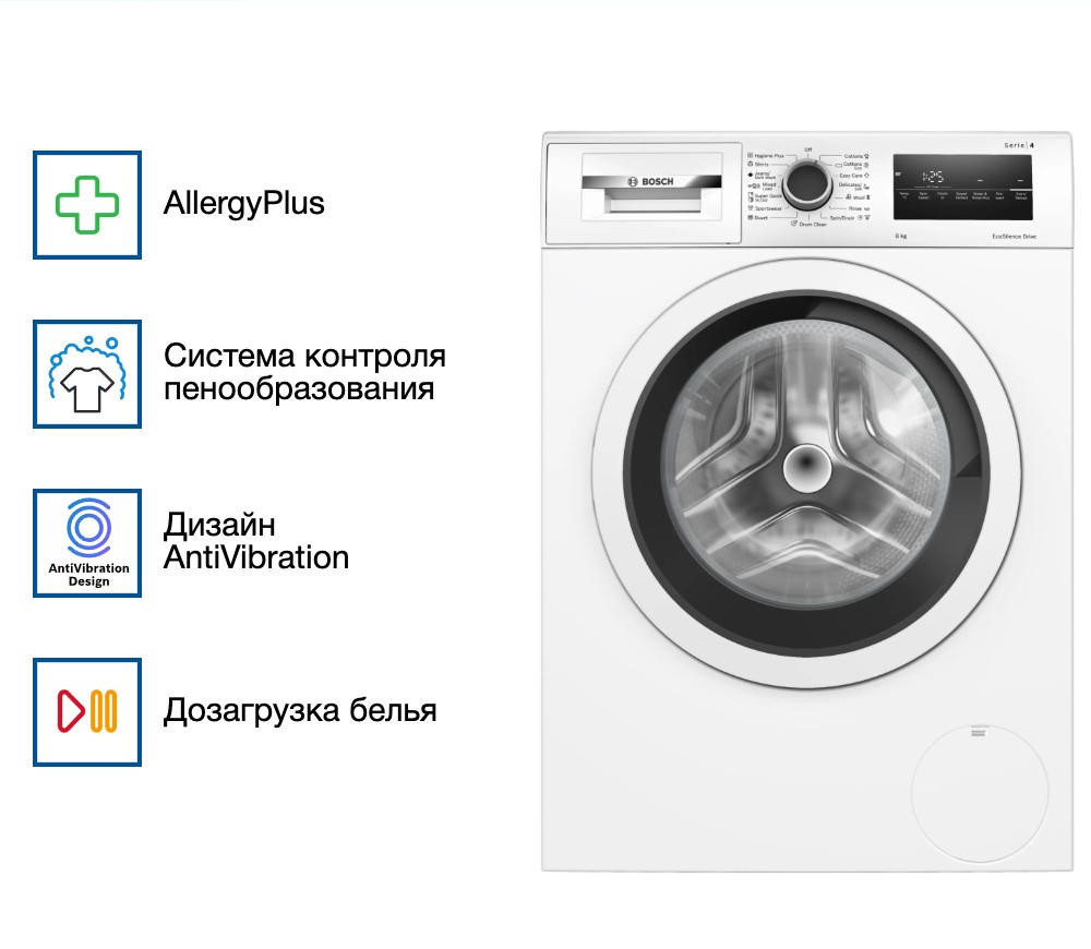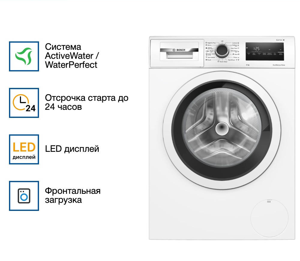 Стиральная машина Bosch WAN24200ME из линейки Serie 4 — это удачное сочетание надёжности, современных технологий и эстетичного дизайна. Светлый корпус органично вписывается в любое пространство — от компактной ванной до уютной прачечной, не нарушив общий стиль интерьера. Габариты модели (84,8 x 59,8 x 63,3 см) позволяют разместить её даже в условиях ограниченного пространства, не жертвуя функциональностью.