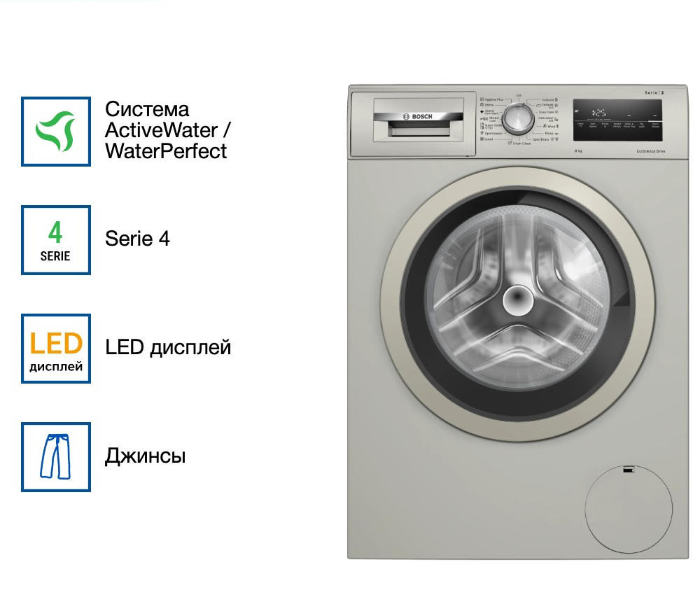 Стиральная машина Bosch WAN2420XME из линейки Serie 4 — это продуманное сочетание эстетики и инженерной надёжности. Серебристый корпус с элементами из нержавеющей стали придаёт устройству современный и утончённый облик, идеально вписывающийся как в компактную ванную, так и в отдельную прачечную. Габариты (84,5 x 60 x 63,3 см) позволяют легко разместить технику даже в условиях ограниченного пространства, не теряя при этом ни в функциональности, ни в вместимости.