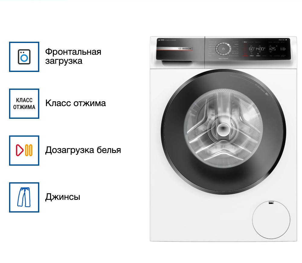 Стиральная машина Bosch WGB244ALSN из серии Serie 8 разработана для тех, кто ищет сочетание продуманной технологии и аккуратного внешнего вида. Светлое исполнение корпуса выглядит нейтрально и легко адаптируется к различным интерьерным решениям — от современной кухни до отдельной зоны для ухода за бельем. При размерах 84.5 см по высоте, 59.8 см по ширине и 59 см по глубине модель подходит для установки в ограниченном пространстве, сохраняя при этом объем барабана 65 литров.