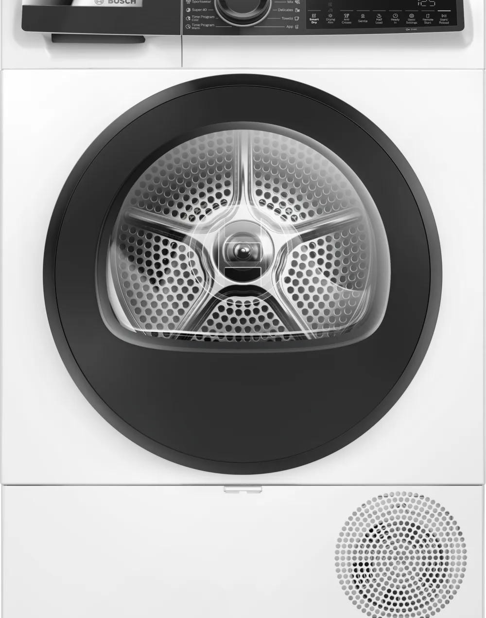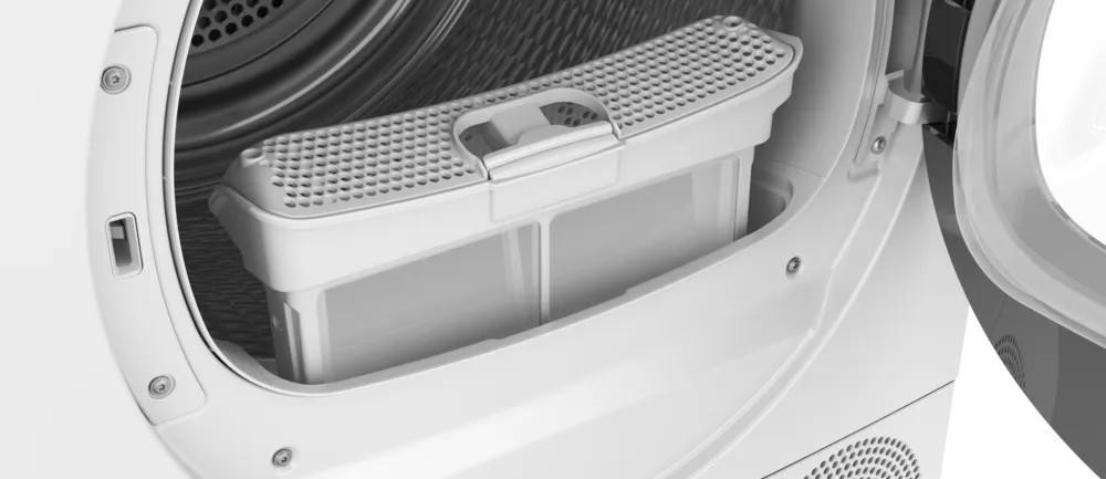 Сушильная машина Bosch WQK25200ME в классическом белом исполнении раскрывает продуманную эстетику и практичность, характерные для серии Serie | 6: строгие линии фасада сочетаются с мягкими деталями панели управления, а продуманная эргономика обеспечивает удобство размещения отдельно стоящего прибора. Компактные габариты — высота 84.2 см, ширина 59.8 см, глубина 64.8 см — позволяют легко интегрировать устройство в стандартную нишу или поставить у наружной стены, при этом конструкция с боковыми панелями AntiVibration снижает вибрацию и шум, делая работу менее заметной в жилых помещениях. Правая навеска дверцы обеспечивает комфортный доступ к барабану, внутри которого установлен нержавеющий барабан: мягкая поверхность и особая форма обеспечивают деликатную обработку ткани, препятствуют спутыванию и механическим повреждениям волокон.