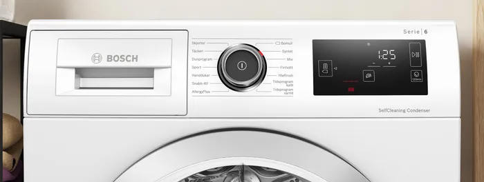 Управление реализовано в электронном формате и сочетает поворотный селектор с сенсорными элементами. Такой подход делает выбор программ простым и понятным. LED-дисплей отображает ход выполнения цикла и уведомляет о необходимости обслуживания фильтра или контейнера для конденсата. Функция отсрочки старта до 24 часов позволяет запускать сушку в удобное время, подстраивая работу устройства под повседневный график.